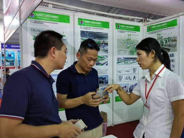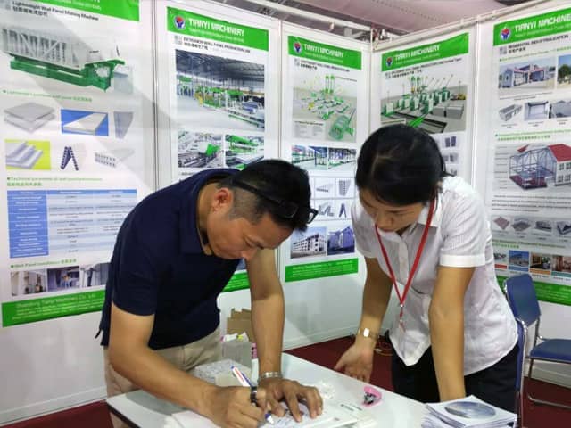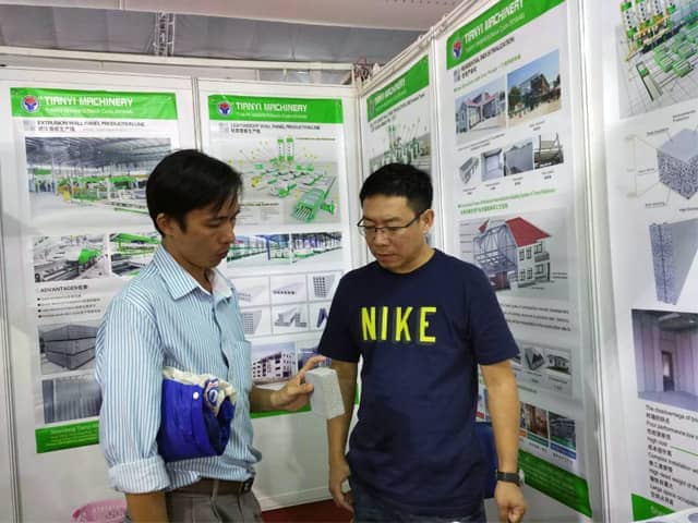 越南是亞洲經濟發展速度的國家之一。近年來,越南正加大對基礎設施建設和主要城市居民住宅的改造力度,綠色建筑建材裝備缺口巨大,為適應市場需求,天意機械攜綠色建材設備參展了此次展會。展會期間,外貿銷售部李經理,認真對待每位來訪的客戶,詳細向其介紹天意機械專利產品輕質墻板生產線,復合墻板生產線,保溫裝飾一體化板生產線等產品的優勢,以及設備在東南亞地區建筑建材市場的影響,展會現場就有多數客戶,初步簽訂了輕質墻板生產線、復合墻板生產線加工生產訂單。