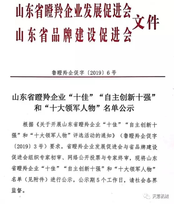 根據《關于開展山東省瞪羚企業十佳”“自主創新十強十大領軍人物評選活動的通知》(魯瞪羚企促字〔20193號)要求,2019126日,山東省瞪羚企業發展促進會、山東省品牌建設促進會發布魯瞪羚企促字[2019]6號文,公布經過專家初審、網絡公開投票與專家終審,評選出了山東省瞪羚企業十佳自主創新十強十大領軍人物。天意機械榮獲“山東省十佳瞪羚企業”稱號。