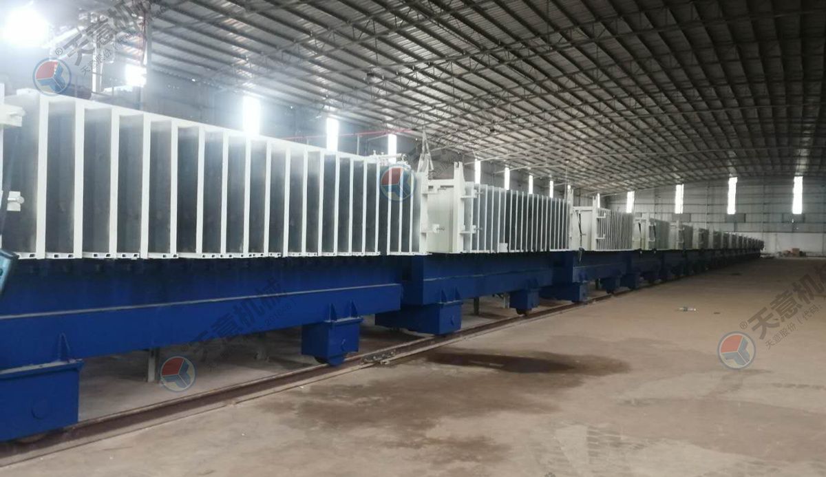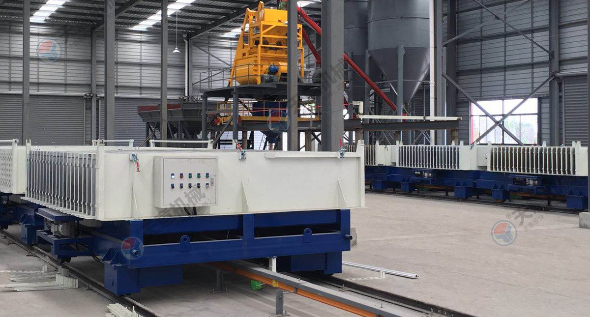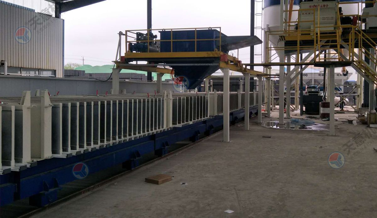 TY20型輕質(zhì)墻板生產(chǎn)線包括:墻板成型機(jī)、整體穿抽管系統(tǒng)、發(fā)泡系統(tǒng)、水箱、電子計量儲料倉、螺旋上料輸送機(jī)、儲料罐、螺旋輸送機(jī)、EPS熟化料倉、硫化干燥床、EPS預(yù)發(fā)機(jī)、數(shù)控配電室、發(fā)泡攪拌機(jī)、整體出板系統(tǒng)、叉車、成品堆放區(qū)、擺渡車。